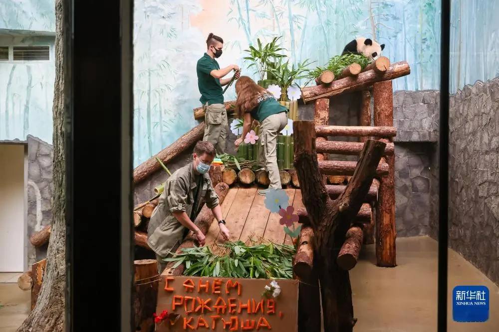2024年8月24日,在俄罗斯莫斯科动物园,工作人员为大熊猫“喀秋莎”组装“生日蛋糕”。新华社记者 白雪骐 摄