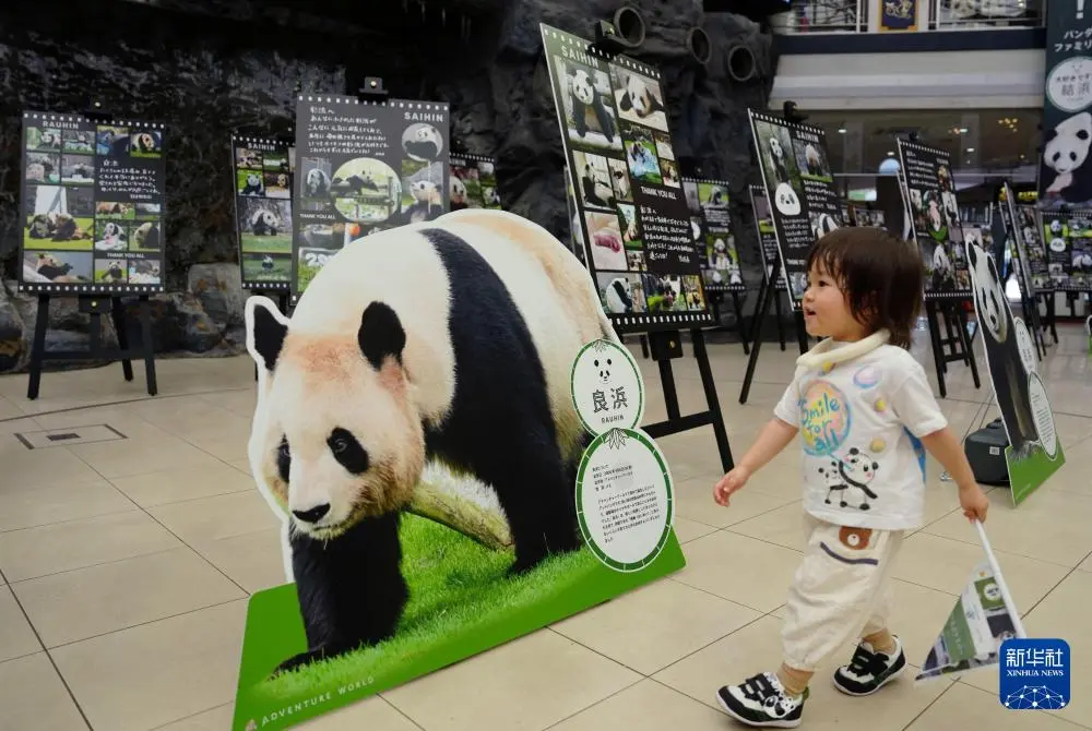 2025年6月27日,在日本和歌山县,一名儿童在白浜冒险世界游乐园内欣赏四只旅日大熊猫的回忆照片展。新华社记者 贾浩成 摄