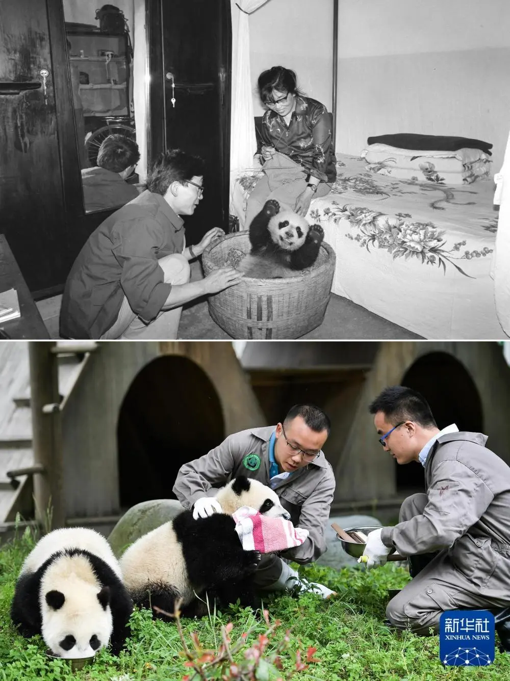 拼版照片:上图为1984年,原四川省平武县林业局助理工程师钟肇敏(左)给野生大熊猫幼崽“龙龙”喂食。钟肇敏自1965年起一直从事自然保护区的建立和大熊猫的保护研究工作,他和他的家人精心护理大熊猫。这是他们把受病饿威胁的熊猫幼仔“龙龙”收留在家里精心喂养。“龙龙”的“小床”就放在他们的卧室里(新华社记者 金勖琪 摄);下图为2019年5月26日,在中国大熊猫保护研究中心卧龙神树坪基地,饲养员在照顾“熊猫幼儿园”内的大熊猫(新华社记者 薛玉斌 摄)。