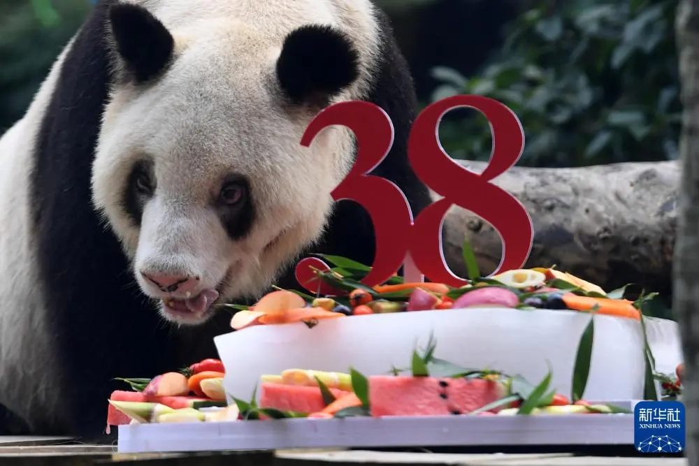 2020年8月16日,大熊猫“新星”在38岁生日会上享用水果生日蛋糕。新华社记者 唐奕 摄
