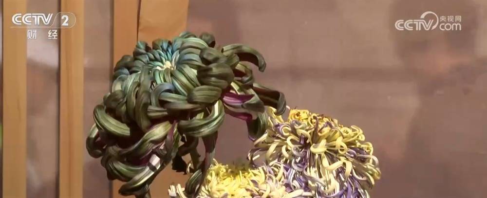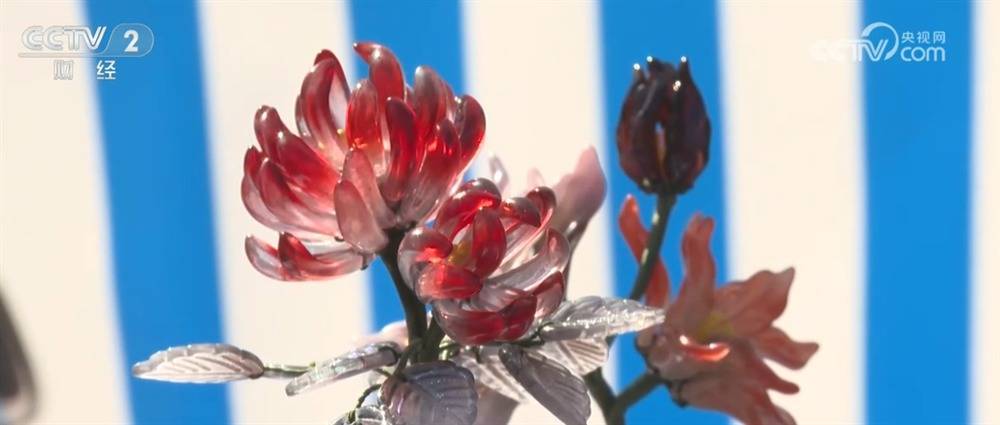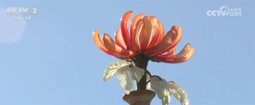除了新培育的菊花品种、别出心裁的盆景造型,这里还有刚刚上新的秋日文创。大家看,这个市集人气很旺,大家可以现场体验玉石盆景的工艺。记者也动手制作了一款菊花小瓶插,把它对着阳光效果会更好,因为它是渐变色的琉璃质地,所以光线一照格外透润、栩栩如生。